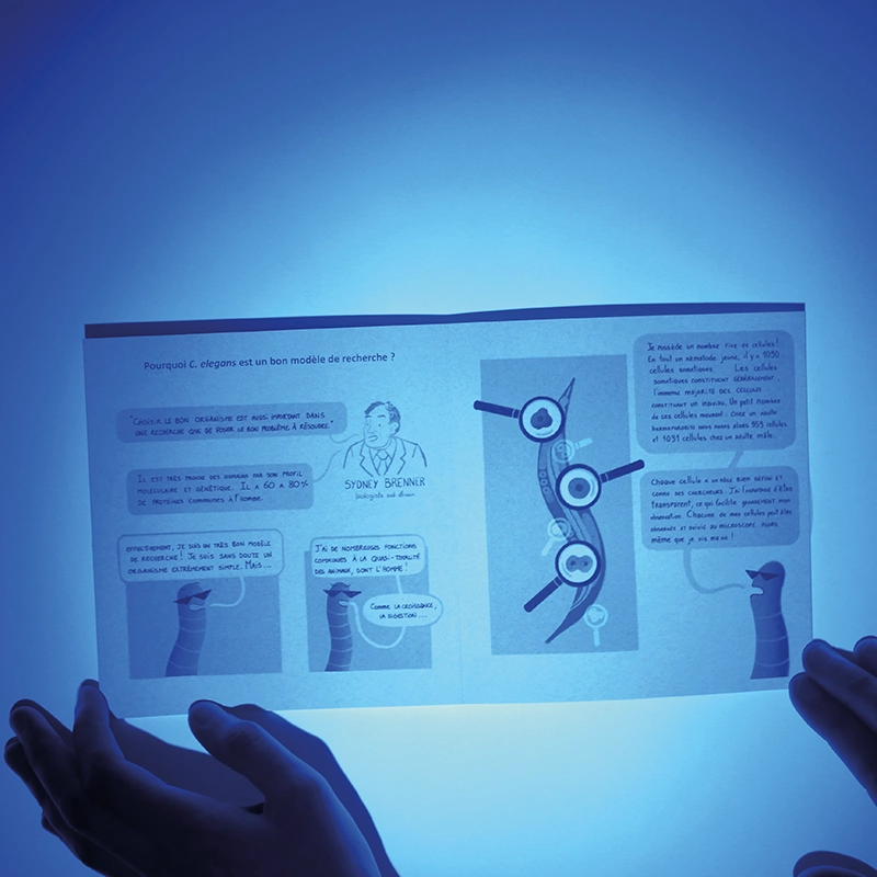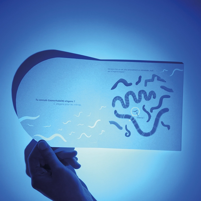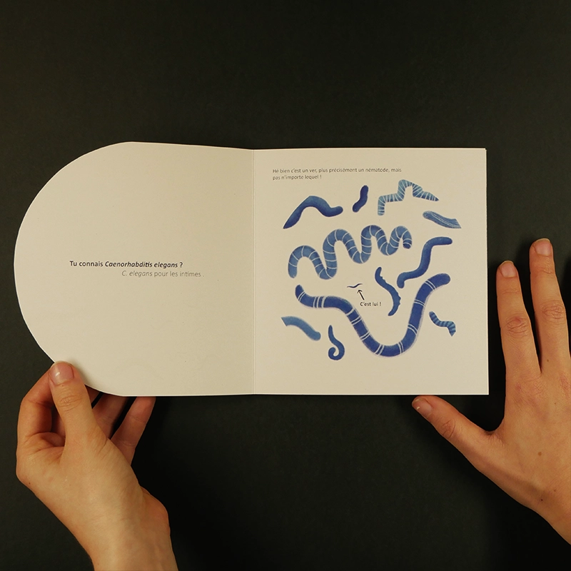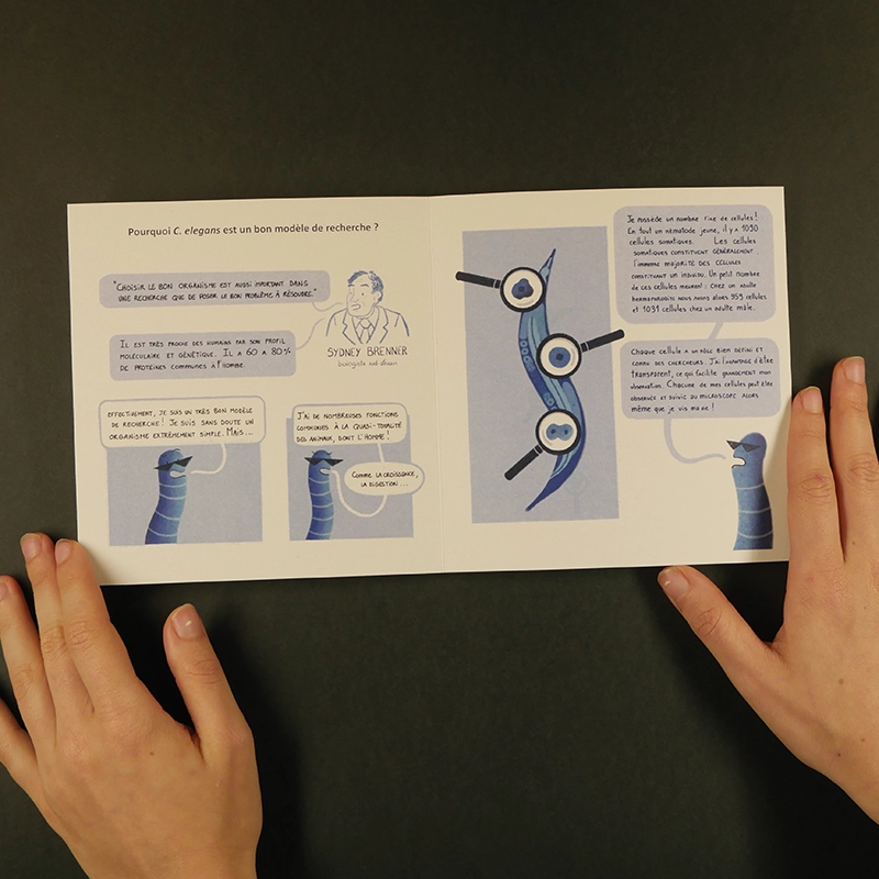 Le guide du C. elegans est un livre illustré à destination des collégiens. Le but de ce livre est de faire découvrir le Caenorhabditis Elegans, un petit nématode d’un millimètre, qui fait partie des modèles de recherche pour les biologistes. Dans un ton humoristique, je vulgarise ce petit ver en le dessinant en tant que personnage qui raconte qui il est.