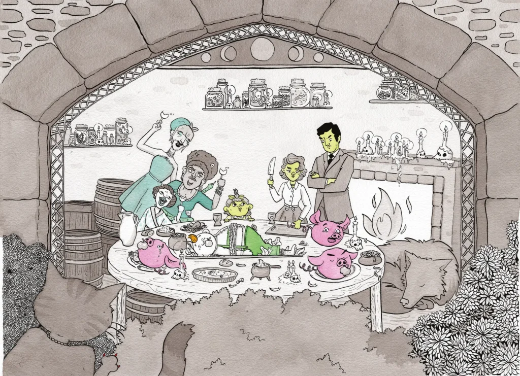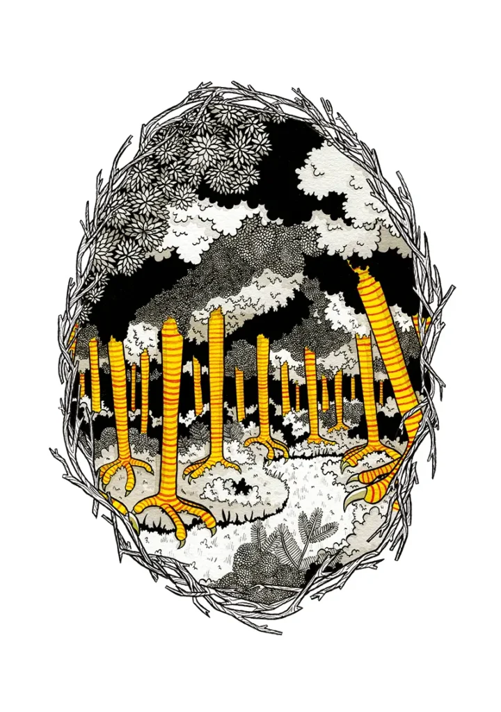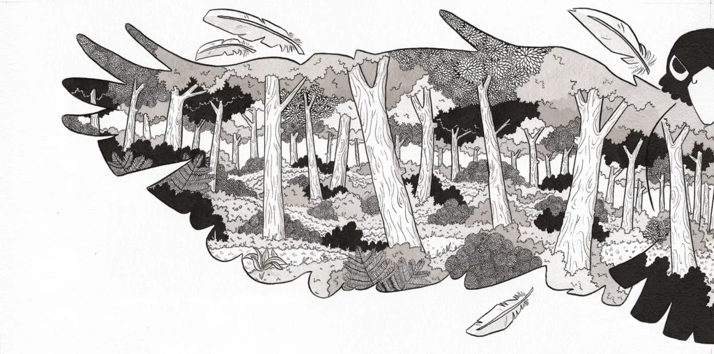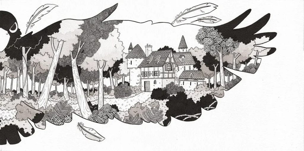 [Réalisations de 5 illustrations doubles pleines pages et 10 illustrations à l’encre et encre de chine]